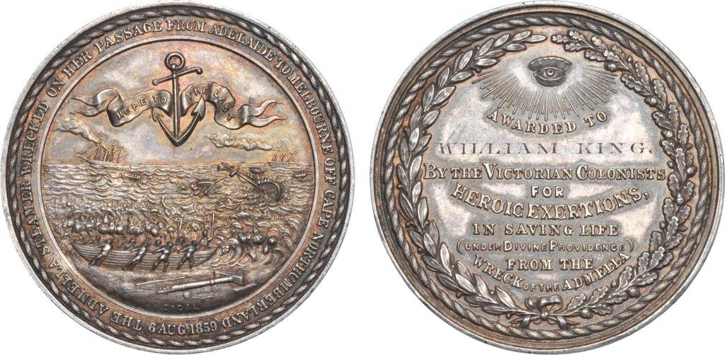 The Admella was was a steam ship the name of which represented the first letters of its route (Adelaide, Melbourne and Launceston), which was wrecked just off the coast of the coast of Mount Gambier in the early hours of 6th August 1859. The Corio out of Adelaide and the Ladybird out of Portland were immediately dispatched, and through their crew’s valiant efforts they were able to rescue 24 survivors, despite the treacherous conditions. A number of gold and 39 silver medals were issued to the rescuers by a grateful public.